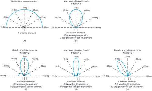 最后向ULA添加第4個(gè)天線陣元可進(jìn)一步改善主瓣選擇性,見(jiàn)圖1(d)。功率零點(diǎn)的數(shù)量也從兩個(gè)增加到三個(gè)。兩個(gè)零點(diǎn)現(xiàn)在位于+/-30°方位角,第三 個(gè)位于ULA天線軸線上。現(xiàn)在,兩個(gè)不同功率旁瓣的信息清晰可見(jiàn),位于+/-50°方位角處。兩個(gè)旁瓣的功率電平都低于主瓣。最終的波束方向圖不僅由 ULA物理幾何形狀和陣元間距決定,還受到每個(gè)天線陣元上發(fā)射的每個(gè)信息符號(hào)副本所接受的相對(duì)幅度和相位加權(quán)的影響。這可以通過(guò)在四個(gè)天線陣元中的每一個(gè) 上引入+90 °相對(duì)相移來(lái)證明。結(jié)果是主波束位置從0°方位角轉(zhuǎn)移到-30°方位角,如圖1(e)所示。請(qǐng)注意,零位和旁瓣位置還受新加權(quán)值的影響。