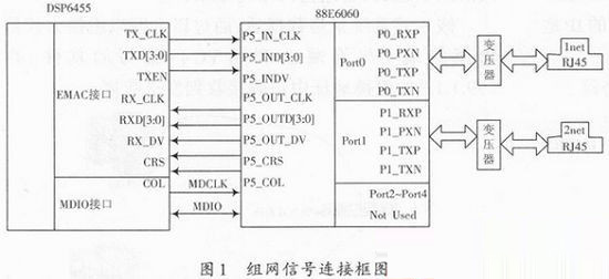 設(shè)計過程中,使用88E6060的port5作為MII接口與DSP6455的EMAC接口進行連接,port0~port4可以任意使用,作為PHY對外進行連接。本設(shè)計以應(yīng)用port0和port1為例進行說明,其他情況相似。配置時將88E6060的ENABLE_MII5和DISABLE_MII4管腳懸空,通過其內(nèi)部上拉/下拉使能port5的MII口,DSP6455通過MDIO接口對88E6060的內(nèi)部PHY寄存器進行訪問,通過EMAC接口發(fā)送和接收網(wǎng)絡(luò)數(shù)據(jù)。