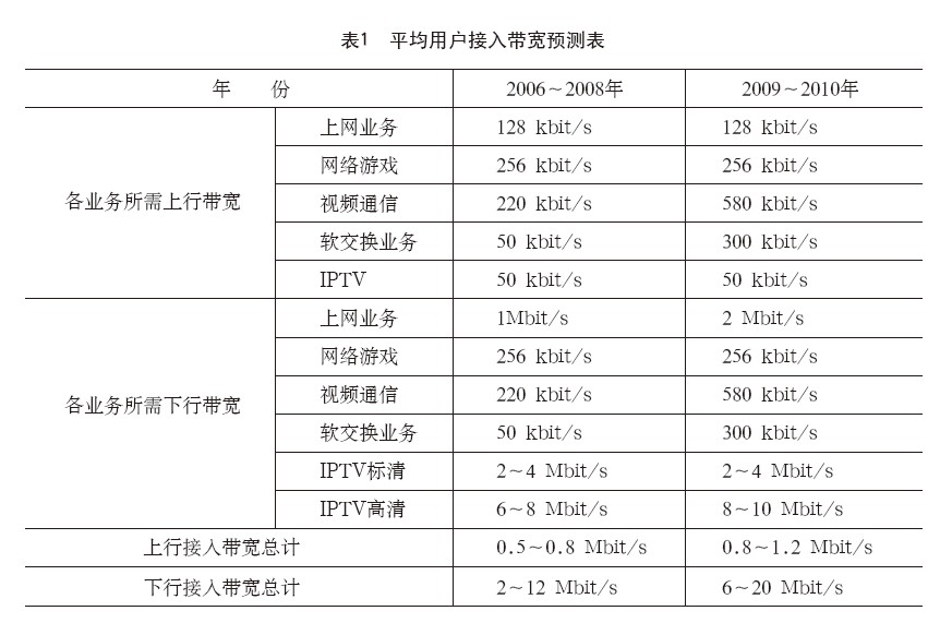 近年來,中國(guó)互聯(lián)網(wǎng)發(fā)展迅速。據(jù)最新數(shù)據(jù)統(tǒng)計(jì),截止2008年,中國(guó)互聯(lián)網(wǎng)用戶數(shù)量已達(dá)2.44億。同時(shí)伴隨互聯(lián)網(wǎng)的持續(xù)快速發(fā)展,VoIP、高清視頻點(diǎn)播、HDTV、網(wǎng)絡(luò)游戲等新業(yè)務(wù)層出不窮,但是國(guó)內(nèi)目前較低的帶寬正日益成為國(guó)內(nèi)互聯(lián)網(wǎng)發(fā)展的瓶頸,預(yù)計(jì)到未來3~5年內(nèi),人均帶寬需求將突破10MBit/s。國(guó)內(nèi)互聯(lián)網(wǎng)接入技術(shù)經(jīng)歷了撥號(hào)、ISDN、xDSL技術(shù)階段,目前國(guó)內(nèi)約有1.2億寬帶用戶,其中70%為xDSL方式接入,由于xDSL接入采用銅線為介質(zhì),每戶傳輸材料成本較高。此外xDSL還存在帶寬較低,傳輸距離短、易受雷擊影響等因素。以國(guó)內(nèi)目前主流的ADSL技術(shù)為例,目前國(guó)內(nèi)運(yùn)營(yíng)商所提供的實(shí)際帶寬為512kbit/s~2Mbit/s為主。目前各大運(yùn)營(yíng)商正逐步提供Triply P1ay三重服務(wù),即語音、數(shù)據(jù)、視頻三網(wǎng)合一的需求,如表1所示。此為目前國(guó)內(nèi)平均用戶接入帶寬預(yù)測(cè)表,以目前各大運(yùn)營(yíng)商所提供的帶寬,根本沒有辦法滿足最低需求。因此隨著無源光纖網(wǎng)絡(luò)PON(Passive Optical Network)技術(shù)的發(fā)展,以FTTX技術(shù)為主導(dǎo)的接入網(wǎng)技術(shù)正在全球起飛,成為新的接入網(wǎng)技術(shù)熱點(diǎn),而國(guó)內(nèi)各大營(yíng)運(yùn)商也提出了“光進(jìn)銅退”策略,擬主用光纖逐步取代通信銅線纜,并最終演進(jìn)至FTTH。