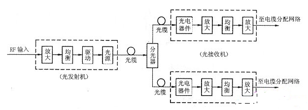 前端合成的多路電視射頻信號,通過電纜連接頭送入光發(fā)射機,光發(fā)射機將射頻信號送入光源驅(qū)動電路放大并驅(qū)動光源,把射頻信號調(diào)制在光載波上成為光調(diào)制信號,并經(jīng)光纖連接器送入光纜。在光接收端,光信號由光分路器和光纖連接器傳送到光接收機,光接收機通過光/電轉(zhuǎn)換,將光纜傳送來的光信號解調(diào)還原為原來的射頻調(diào)制信號,連接上同軸電纜分配網(wǎng)絡,把電視信號分配給電視用戶。
