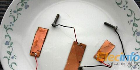 這是水果電池的電極,陽(yáng)極是做PCB的覆銅板,陰極是鍍鋅螺絲。將上述電極浸入滴過(guò)醋的三個(gè)水杯里,我測(cè)到水果電池的容量能達(dá)到:空載電壓3V,短路電流400uA。