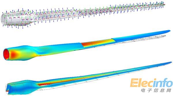 風(fēng)力發(fā)電機(jī)葉片的復(fù)合層壓結(jié)構(gòu)分析。從上到下:殼局部坐標(biāo)系,外殼與翼梁中的 von Mises 應(yīng)力分布結(jié)果圖。