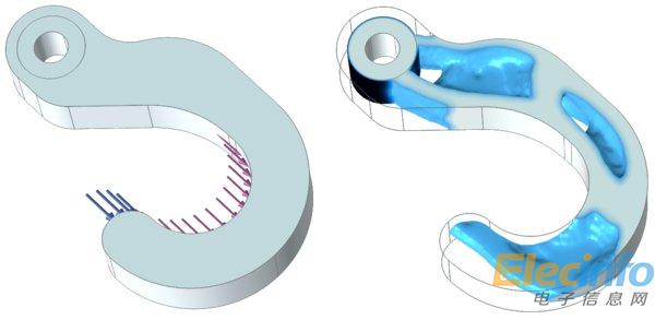 鋼制掛鉤的拓?fù)鋬?yōu)化,仿真根據(jù)不同的載荷工況,確定相應(yīng)的最佳材料分布。