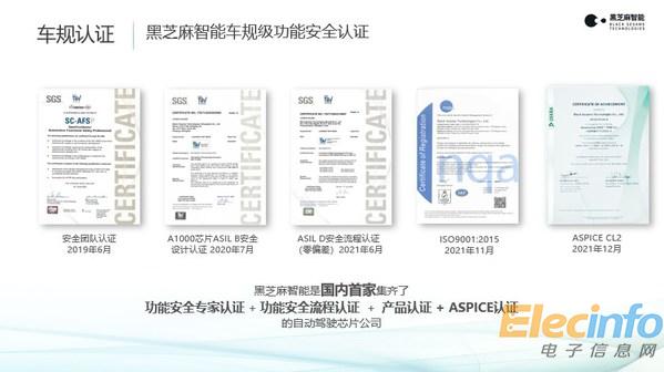 黑芝麻智能創(chuàng)始人兼CEO單記章強調:"黑芝麻智能的所有芯片都是嚴格按照車規(guī)要求進行設計開發(fā)。芯片‘上車'最重要的就是安全認證,我們肯定要‘持證上崗'。"黑芝麻智能已獲得ASPICE CL2車規(guī)級軟件認證、ISO 26262:2018 ASIL D功能安全流程認證、ISO26262功能安全產(chǎn)品ASIL B認證和AEC-Q100 可靠性認證,是國內(nèi)首家集齊了功能安全專家認證、功能安全流程認證和產(chǎn)品認證的自動駕駛芯片公司,構建起完善可靠的車規(guī)認證體系。