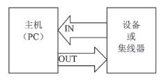 1. 標(biāo)記包。USB 中所有事務(wù)都是由主機(jī)(PC)來(lái)完成的。IN 表示數(shù)據(jù)被讀入PC,OUT 表示數(shù)據(jù)由主機(jī)送出至設(shè)備,如圖6 所示。