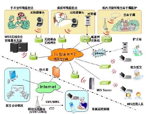 通過構(gòu)架寬帶無線局域網(wǎng)(WIFi),以802.11作為無線連接協(xié)議,支持互連協(xié)議DLNA、IGRS,甚至UPnP,支持采用支持無線寬帶路由的視頻監(jiān)控設(shè)備,在病房指定監(jiān)護(hù)點(diǎn)內(nèi)設(shè)置無線攝像頭,通過無線路由器將圖象傳輸?shù)阶o(hù)士站的監(jiān)控屏,從而方便醫(yī)生、護(hù)士在與病人對(duì)講時(shí),還能觀察到病房?jī)?nèi)病人的實(shí)際情況,進(jìn)行實(shí)時(shí)監(jiān)控;同時(shí),配置的無線安全存儲(chǔ)系統(tǒng)(WSS)可以自動(dòng)接收通過無線傳輸?shù)膱D象,以便值班醫(yī)生和主治醫(yī)生可以非現(xiàn)場(chǎng)了解病人的病情和狀態(tài),甚至可以通過互聯(lián)網(wǎng)取得需要的實(shí)時(shí)圖象,檢索和查詢歷史圖象。系統(tǒng)還可以根據(jù)醫(yī)生要求,通過無線方式,對(duì)病人增加多個(gè)監(jiān)控點(diǎn),進(jìn)行靈活按需監(jiān)控。圖中的設(shè)備均留有與局域網(wǎng)的接口,可以通過有線的方式接入網(wǎng)絡(luò),形成多種解決方案,并可與醫(yī)院現(xiàn)行的醫(yī)院信息管理系統(tǒng)、移動(dòng)通信、互聯(lián)網(wǎng)有機(jī)融合。