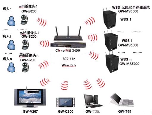 系統(tǒng)的最大特點(diǎn)是采用無線攝像頭(構(gòu)成監(jiān)控站點(diǎn))、無線監(jiān)控屏(WLCD)和無線安全數(shù)據(jù)存儲(chǔ)陣列硬盤組WSS(監(jiān)控?cái)?shù)據(jù)中心)、無線集線器(WSwitch)等構(gòu)成監(jiān)控系統(tǒng)的主體。其優(yōu)點(diǎn)在于部署方便,且可以動(dòng)態(tài)配置,在任何需要采集視頻的地方都可以架設(shè),甚至在醫(yī)院的任何一個(gè)住院科室、急診室進(jìn)行單獨(dú)部署。通過在百米范圍內(nèi)部署的無線路由器,無線攝像頭可以把視頻圖像實(shí)時(shí)的傳輸?shù)骄W(wǎng)絡(luò)上。