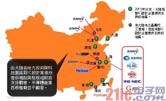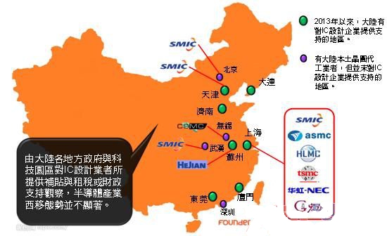 產(chǎn)業(yè)的發(fā)展離不開政策的支持和財(cái)政的補(bǔ)貼,除政府對半導(dǎo)體產(chǎn)業(yè)于財(cái)稅持與重大專項(xiàng)的補(bǔ)貼之外,部分地方政府及所屬園區(qū)為打造半導(dǎo)體產(chǎn)業(yè)聚落,亦有對半導(dǎo)體業(yè)者提供補(bǔ)貼與財(cái)政支持。截至2013年1月為半導(dǎo)體業(yè)者提供財(cái)務(wù)支持的地區(qū)包括大連、天津、濟(jì)南、上海、蘇州、廈門、東莞等7座城市。