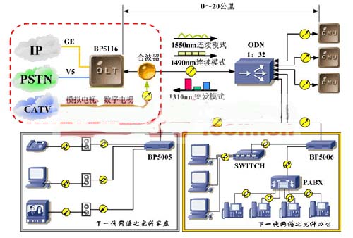 近年來,接入網(wǎng)所承載的主體業(yè)務(wù)正逐漸由語音、數(shù)據(jù)向視頻、圖像轉(zhuǎn)變。這就需要高速、對稱、大范圍(20km)的接入網(wǎng)來連接城域網(wǎng)/主干網(wǎng)和用戶網(wǎng)。傳統(tǒng)的接入網(wǎng)已逐漸不能滿足這種需求,而光纖由于其近乎無限的帶寬被人們認(rèn)為是接入網(wǎng)媒質(zhì)的不二之選,光纖到戶(FTTH)也成為滿足帶寬暴漲的終極選擇。為了充分利用光纖和設(shè)備資源,節(jié)省運行和維護(hù)費用,人們選擇點到多點的無源光網(wǎng)絡(luò)(PON)作接入,而在此基礎(chǔ)上實現(xiàn)傳統(tǒng)電信網(wǎng)、計算機(jī)網(wǎng)和有線電視網(wǎng)融合的“三網(wǎng)合一”則是進(jìn)一步降低成本的可行、有效的方案,也是網(wǎng)絡(luò)發(fā)展的大趨勢。