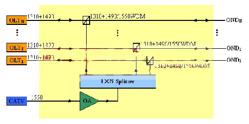 圖1為目前應(yīng)用較廣的一種基于PON結(jié)構(gòu)的FTTH方案,應(yīng)用wavelength division multiplexing(WDM)技術(shù)實現(xiàn)上行1310nm波段、下行1490nm波段和廣播CATV 1550nm波段信號光的單纖傳輸,并使用time-division multiple access(TDMA)實現(xiàn)多用戶的帶寬共享。