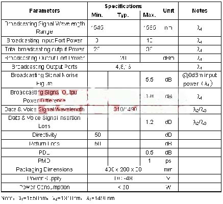若考慮參與合波的承載CATV業(yè)務(wù)的1550nm信號光光功率為16dBm,當(dāng)圖1和圖2中N>8時,光放大器OA的總輸出功率應(yīng)>27dBm(假設(shè)Splitter與連接器的固有損耗為2dB),這對于常規(guī)的EDFA來說,無論技術(shù)還是成本都已經(jīng)非常困難。武漢光迅科技股份有限公司開發(fā)的高功率光纖放大器(HFA)采用鉺鐿共摻雙包層光纖和側(cè)向包層泵浦技術(shù),其最大輸出功率達(dá)36dBm,且單位mW的價格明顯低于普通EDFA。表1為集成HFA和1310+1490/1550WDM的OPAMS的性能指標(biāo)。