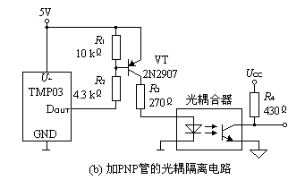 (a)圖為普通光耦隔離電路。TMP03能夠承受5 mA以下的灌電流,可直接與光耦中LED發(fā)光二極管的陰極連通。此時(shí)上拉電阻 R1還起到限流作用,防止LED過(guò)流損壞。取 R1=620歐姆,當(dāng)DOUT端呈低電平時(shí),灌電流小于1 mA,LED上的正向壓降僅為1 V左右。需要注意的是,光耦合器的開(kāi)啟和關(guān)閉時(shí)間必須完全相同,否則會(huì)導(dǎo)致被傳輸?shù)臄?shù)據(jù) 發(fā)生錯(cuò)誤。某些達(dá)林頓型光耦合器(例如4N32)的開(kāi)啟時(shí)間遠(yuǎn)大于關(guān)閉時(shí)間,不能在此使用。