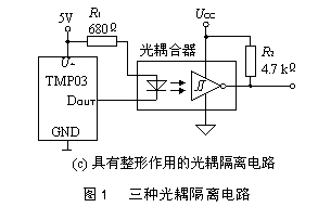 (c)圖中采用施密特整形輸出的光耦合器,能降低傳輸噪聲。