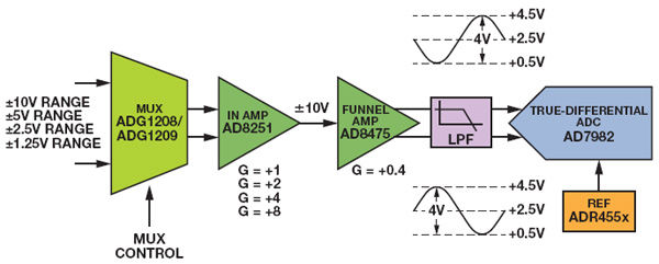 工業(yè)設(shè)計(jì)人員可以使用分立式高性能組件,為PLC或類似數(shù)據(jù)采集系統(tǒng)構(gòu)建模擬模塊,如圖2所示。主要設(shè)計(jì)考慮因素包括輸入信號(hào)配置、整體系統(tǒng)速度、精度和精確性。此處所示的信號(hào)鏈采用ADG1208/ADG1209低泄漏多路復(fù)用器、AD8251快速建立可編程增益儀表放大器(PGIA)、AD8475高速漏斗放大器、AD7982差分輸入18位PulSAR ADC和ADR4550超低噪聲基準(zhǔn)電壓源。這種解決方案提供四個(gè)不同增益范圍,但在±10 V的最大輸入信號(hào)的情況下,設(shè)計(jì)人員必然會(huì)擔(dān)心多路復(fù)用器的切換和建立時(shí)間,以及其他模擬信號(hào)調(diào)理問(wèn)題。此外,在1 MSPS速率下實(shí)現(xiàn)真正的16位性能可能是一個(gè)嚴(yán)峻挑戰(zhàn),即便在使用這些高性能器件時(shí)也是如此。