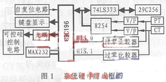 本電網(wǎng)無(wú)功功率補(bǔ)償控制系統(tǒng)的硬件組成框圖如圖1所示。它主要有單片機(jī)系統(tǒng)(由80196單片機(jī)、74LS373、FLASH MEMERY 29C256組成的自復(fù)位電路)、鍵盤顯示電路、輸入電路、輸出電路和通信接口電路MAX232等部分組成。