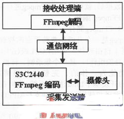 系統(tǒng)是在S3C2440平臺上運行嵌入式Linux系統(tǒng),使用CMOS攝像頭OV9650獲取實時視頻圖像數(shù)據(jù),采用H264標準通過FFmpeg原始視頻進行壓縮編碼成視頻流,通過網(wǎng)絡(luò)傳輸,用戶在接收處理端經(jīng)過FFmpeg解碼之后,使用OpenCV顯示播放即可實時查看遠程視頻圖像。