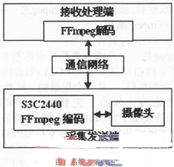 系統(tǒng)由兩部分組成:采集發(fā)送端和接收處理端,采用Client/Server設(shè)計(jì)模式來(lái)實(shí)現(xiàn)兩者之間的相互通信,由接收處理端向采集發(fā)送端發(fā)送控制信號(hào),采集發(fā)送端開(kāi)啟攝像頭進(jìn)行視頻數(shù)據(jù)采集,采集的原始視頻數(shù)據(jù)是yuv422格式,經(jīng)過(guò)FFmpcg編碼壓縮成H.264格式視頻流,經(jīng)通信網(wǎng)絡(luò)傳輸?shù)浇邮仗幚矶?接收處理端接收到視頻流數(shù)據(jù)后,經(jīng)FFmpeg解碼,通過(guò)OpenCV進(jìn)行顯示。采集發(fā)送端視頻數(shù)據(jù)采集和發(fā)送采用三星公司的具有ARM920T內(nèi)核的S3C2440作為嵌入式微控制器,接收處理端采用普通電腦。系統(tǒng)方案如圖1所示。