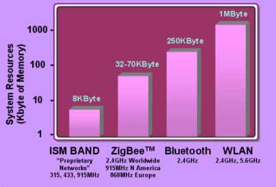 ZigBee協(xié)議相對較輕巧,它的代碼空間為32-70KB,數(shù)據(jù)傳輸范圍適中,為10-100米。這些特點(diǎn)讓ZigBee成為了工業(yè)網(wǎng)絡(luò)的首選。ZigBee的一大優(yōu)點(diǎn)是其“網(wǎng)狀”能力。網(wǎng)狀網(wǎng)絡(luò)允許節(jié)點(diǎn)間的信息傳輸;這樣一來,就算任何節(jié)點(diǎn)出現(xiàn)故障或掉線,信息也能順利傳輸至目的地。網(wǎng)狀網(wǎng)絡(luò)的數(shù)據(jù)包處理非常復(fù)雜,因此,所需的程序內(nèi)存較大。圖2給出了各無線網(wǎng)絡(luò)的相應(yīng)代碼大小。