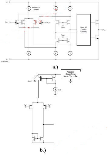 圖1: 互補(bǔ)輸入級(jí)、單電源放大器:a);帶一個(gè)正充電泵的單差動(dòng)對(duì)輸入級(jí):b)。