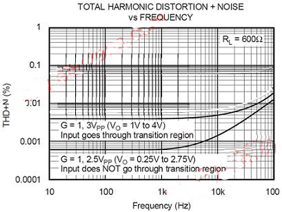 放大器的輸入噪聲是影響THD+N規(guī)范的另一個(gè)因素。高級(jí)別的輸入噪聲和/或高閉環(huán)增益都會(huì)增加放大器的總THD+N水平。
