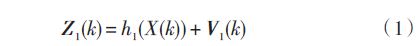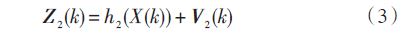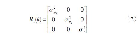φR為雷達(dá)視線方位角,θR 為雷達(dá)視線俯仰角,r 為彈目距離。V1(k) 是均值為零、協(xié)方差陣為R1(k) 的白高斯噪聲向量。