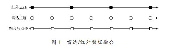 本文綜合應(yīng)用點(diǎn)跡合并方法和點(diǎn)跡串行處理方法,搭建毫米波雷達(dá)和紅外數(shù)據(jù)融合的多傳感器平臺。假設(shè)雷達(dá)的掃描周期為5 ms,紅外的掃描周期為10 ms,所以首先將雷達(dá)和紅外點(diǎn)跡數(shù)據(jù)串行合并成為點(diǎn)跡數(shù)據(jù)流,進(jìn)行點(diǎn)跡-航跡相關(guān);對于在10 ms時(shí)刻,若雷達(dá)點(diǎn)跡和多個(gè)紅外點(diǎn)跡均與航跡相關(guān)上,則對這些點(diǎn)跡進(jìn)行點(diǎn)跡壓縮合并,如圖1所示。