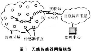 無(wú)線傳感器網(wǎng)絡(luò)模型(如圖1所示)是不同于傳統(tǒng)無(wú)線網(wǎng)絡(luò)的以基礎(chǔ)設(shè)施網(wǎng),通過(guò)在監(jiān)測(cè)區(qū)去內(nèi)隨意布撒大量傳感器節(jié)點(diǎn)(簡(jiǎn)稱節(jié)點(diǎn)),由各節(jié)點(diǎn)自行協(xié)調(diào)并迅速組建通信網(wǎng)絡(luò),在能量利用率優(yōu)先考慮原則下進(jìn)行工作任務(wù)劃分以獲取監(jiān)視區(qū)域的信息,網(wǎng)絡(luò)的自組織特性體現(xiàn)在當(dāng)節(jié)點(diǎn)失效或新節(jié)點(diǎn)加入時(shí)網(wǎng)絡(luò)能夠自適應(yīng)重新組建,以調(diào)整全局的探測(cè)精度,充分發(fā)揮資源優(yōu)勢(shì),即網(wǎng)絡(luò)中的各節(jié)點(diǎn)除具備數(shù)據(jù)采集功能外兼有數(shù)據(jù)轉(zhuǎn)發(fā)實(shí)現(xiàn)多跳的路由功能。