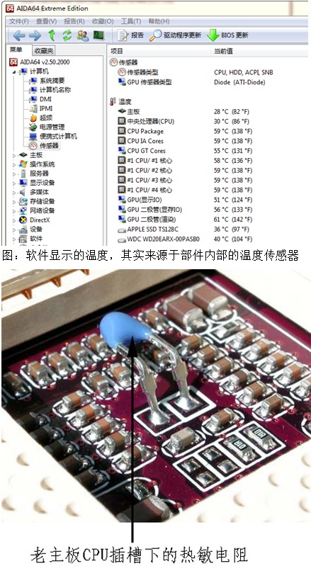 要想在最新的筆記本中看一看溫度傳感器長(zhǎng)什么樣,那可不是件容易的事情,畢竟,外置的電阻無法直接探測(cè)部件內(nèi)部溫度,再加上容易出現(xiàn)接觸不良的問題。因此,只有在老主板的CPU插槽下“一睹芳容”。如今筆記本的溫度傳感器早已置身于各部件芯片中,如處理器、顯卡芯片、硬盤內(nèi)部,通過軟件顯示實(shí)際溫度。
