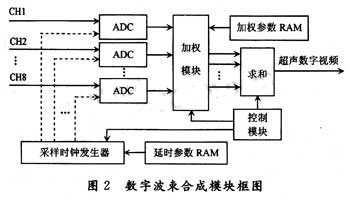 對于具有128陣元和32收發(fā)通道的超聲探頭,在進行32路AD轉換后,將其分為4組,每組8路接收通道,每組用一片F(xiàn)PGA實現(xiàn),在該FPGA內首先進行接收延時和動態(tài)聚焦再進行加權求和,其后再進行組間的求和產生超聲數(shù)字視頻信號。每一組的系統(tǒng)框圖如圖2所示: