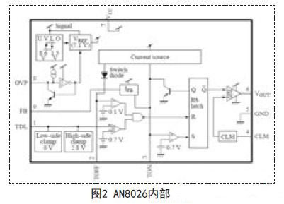 AN8026為松下公司開發(fā)的反激式單端輸出RCC型準(zhǔn)諧振軟開關(guān)驅(qū)動控制器,封裝為SIP 9腳封裝,各個腳號的定義如表1所示,內(nèi)部框圖如圖2所示,其特點如下:
