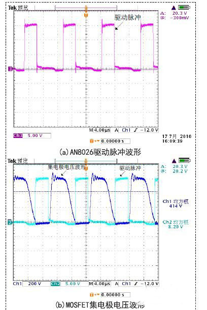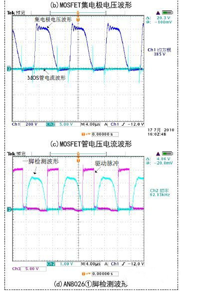 根據(jù)電路原理圖設(shè)計,利用軟件AltiumDesigner Summer 09繪制PCB,并調(diào)試樣機,圖4所示為軟開關(guān)電源實驗波形。