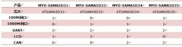 MYD-SAMA5D3X工控板是一個(gè)工控板系列,該系列包含四款具體產(chǎn)品,MYD-SAMA5D31、MYD-SAMA5D33、MYD-SAMA5D34和MYD-SAMA5D35。這四款工控板CPU管腳完全一致,只是內(nèi)部的網(wǎng)口支持、UART串口、LCD液晶屏和CAN總線等資源稍微有所區(qū)別,客戶可以根據(jù)應(yīng)用場合和成本自行選擇合適的型號(hào)。如下是這四款產(chǎn)品的區(qū)別。