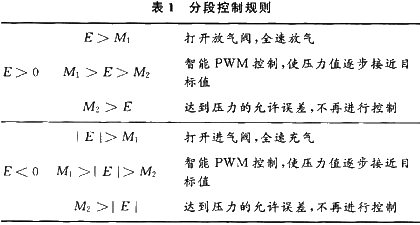 為了實現對機車制動機氣缸既能精確控制,又能夠快速達到目標值,我們對氣缸壓力實行分段控制。單片機有4路開關量輸出,分別對應制動缸的進氣閥、放氣閥和均衡風缸的進氣閥、放氣閥,輸出1代表打開閥門,0代表關閉閥門。我們以pt表示壓力目標值,pi表示當前氣缸壓力值,E表示偏差值。所以,有E=pi-pt。M1,M2表示壓力偏差的絕對值,其中M1>M2,M1表示在接近目標值的一個值,M2表示允許的最大誤差,分段控制規(guī)則如表1所示。