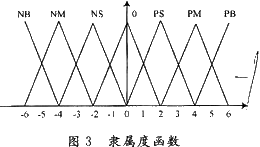 Fuzzy-PID就是根據現場調試得到在PID參數預整定值k′P,k′I,k′D,再利用模糊規(guī)則實時在線整定PID控制器的三個修正參數△kP,△kI和△kD,實現對壓力的優(yōu)化控制。模糊控制器的輸入、輸出變量都是精確量,模糊推理是針對模糊量進行的,因此控制器首先要對輸入量進行模糊化處理。在所設計的Fuzzy-PID控制器中,輸入、輸出變量的語言值均分為7個語言值:{NB,NM,NS,0,PS,PM,PB},他們分別代表負大、負中、負小、零、正小、正中和正大。隸屬度函數采用靈敏性強的三角函數,如圖3所示。