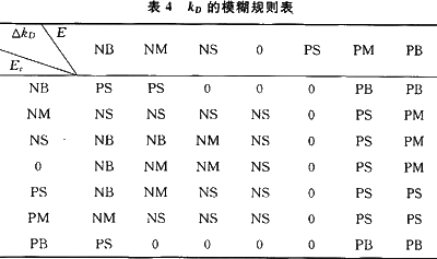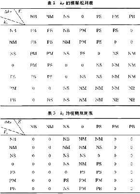 總結工程設計人員的技術知識和實際操作經驗,得到了針對kP,kI,kD三個參數分別整定的模糊控制表,見表2、表3和表4。
