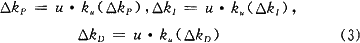 在本系統(tǒng)中,根據偏差E和偏差變化率Ec,取得相應的語言值,根據表1~表3的整定規(guī)則表,經過公式法模糊決策,分別得到3個修正參數△kP,△kI,△kD的模糊量,然后△kP,△kI,△kD要進行去模糊化取得精確量,去模糊化有幾種方法,一般用重心法比較合適,由公式可得: