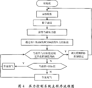 主程序進行一系列的初始化后循環(huán)等待中斷;T0產生2ms定時中斷,T0中斷服務子程序對中斷次數計數,每50次中斷(100ms)為一個控制周期,每一個控制周期讀入當前氣缸壓力采樣值,調用模糊PID子程序對氣缸壓力進行精確控制。