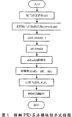 在系統(tǒng)控制電路中,單片機選用ATMEL公司的AT89C55,程序選用C51進行編寫。本系統(tǒng)主要模塊有主程序、T0中斷子程序、模糊PID算法子程序等。主程序流程如圖4所示,模糊PID算法的程序流程如圖5所示。