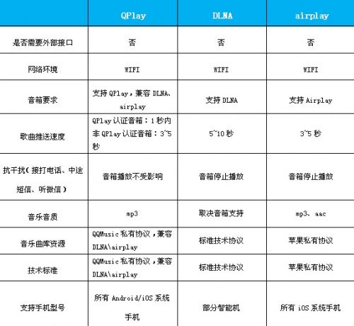 據(jù)了解,目前市面上主流的多媒體連接手機(jī)播放音樂內(nèi)容的方式主要有三種——QPlay、DLNA和Airplay,他們各自也都有著各自的特點。下面,我們通過一個表格簡單了解下他們的共同點及區(qū)別,然后再逐項深入介紹。