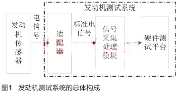 發(fā)動(dòng)機(jī)狀態(tài)檢測(cè)設(shè)備總體構(gòu)成如圖1所示,由適配器、信號(hào)采集處理模塊、硬件測(cè)試平臺(tái)組成。圖中,機(jī)載傳感器敏感被測(cè)對(duì)象發(fā)動(dòng)機(jī)的各種物理量(溫度、壓力、轉(zhuǎn)速等),并將其轉(zhuǎn)換成電信號(hào)。適配器將輸入的電信號(hào)通過處理轉(zhuǎn)化為標(biāo)準(zhǔn)電信號(hào)送給硬件測(cè)試平臺(tái),測(cè)試平臺(tái)對(duì)輸入信號(hào)進(jìn)行相關(guān)運(yùn)算和處理后、通過顯示器顯示最終的測(cè)試結(jié)果;并實(shí)時(shí)保存測(cè)試數(shù)據(jù),為地勤人員進(jìn)一步對(duì)發(fā)動(dòng)機(jī)進(jìn)行故障分析與診斷。