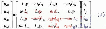 式中:L1為定子繞組電感;r2,L2分別為折算到定子側(cè)的轉(zhuǎn)子繞組電阻和電感;Lm為定轉(zhuǎn)子繞組間的互感;下標(biāo)1,2分別表示定子量和轉(zhuǎn)子量;p為微分算子。