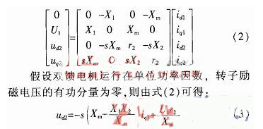 假設(shè)雙饋電機(jī)定子接無窮大電網(wǎng),穩(wěn)態(tài)時(shí),d,q坐標(biāo)系中各相電壓和電流均為直流量,式(1)中p=0。將ω1£1=X1,ω1L2=X2,ω1Lm=Xm代入式(1)得: