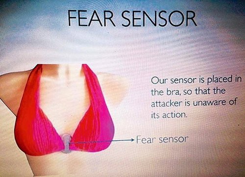 他將“恐懼傳感器”裝在胸罩里、能貼近肌膚,與使用者的手機(jī)與藍(lán)牙連結(jié),當(dāng)感測到使用者散發(fā)恐懼、僵硬的訊息,就會自動傳送“Help Me”(救我)的簡訊,給預(yù)先擬好名單上的人,并且附有求助者的位置。